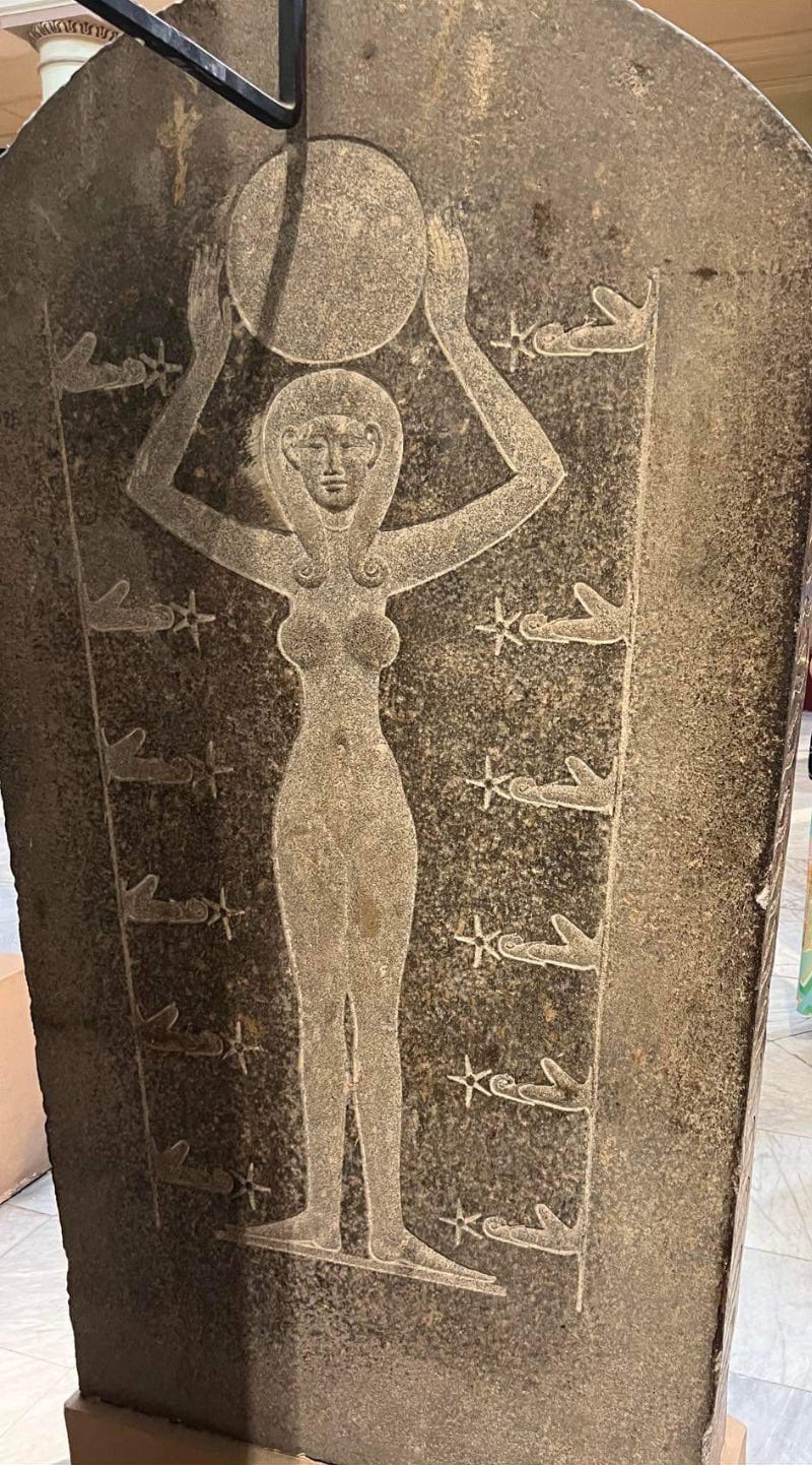 What I found was a goddess holding the Sun disc over her head, surrounded by six symbols on her right and six symbols on her left. The side figures look to me like sitting women in the yogi squat. Each figure has a star on its head, clearly identifying it as either a star or a constellation. But since the observer’s attention is immediately drawn to the central Sun, constellations make far more sense than stars.