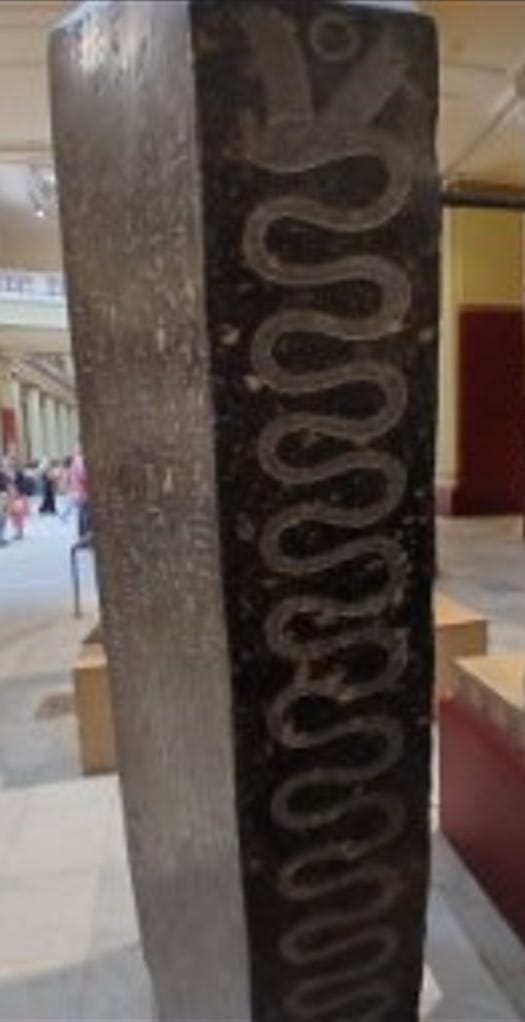 It depicts a winged serpent, identified as Wadjet, symbolising the cycle of resurrection and rebirth. The same emblem is carved on the opposite side of the lid. Wadjet was part of the Nemes, the pharao’s royal headdress.
